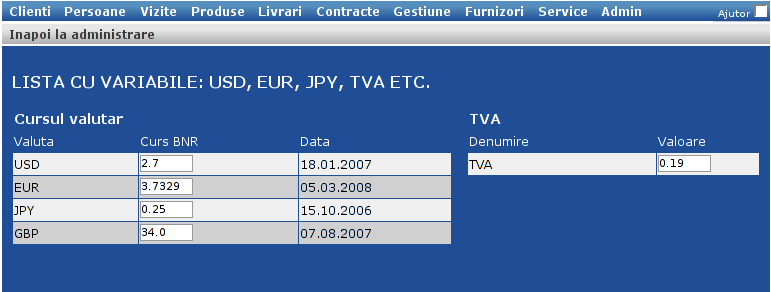 In sectiunea "Curs valutar" se poate completa cursul pentru toate tipurile de valuta inregistrate in baza de date, in cazul in care nu se opteaza pentru preluarea automata a cursului de catre sistem.