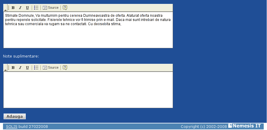 Se deschide pagina "Adauga oferta", in care sunt deja completate datele clientului. Aceasta pagina permite editarea detaliilor generale ale ofertei: date de identificare, modalitate de afisare, valabilitate, conditii, note suplimentare, etc.
